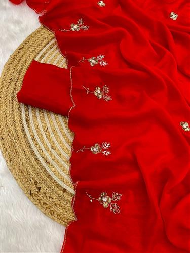 Graceful red saree with intricate premium handwork for a rich, elegant look.Embellished with fine Handwork detailing.