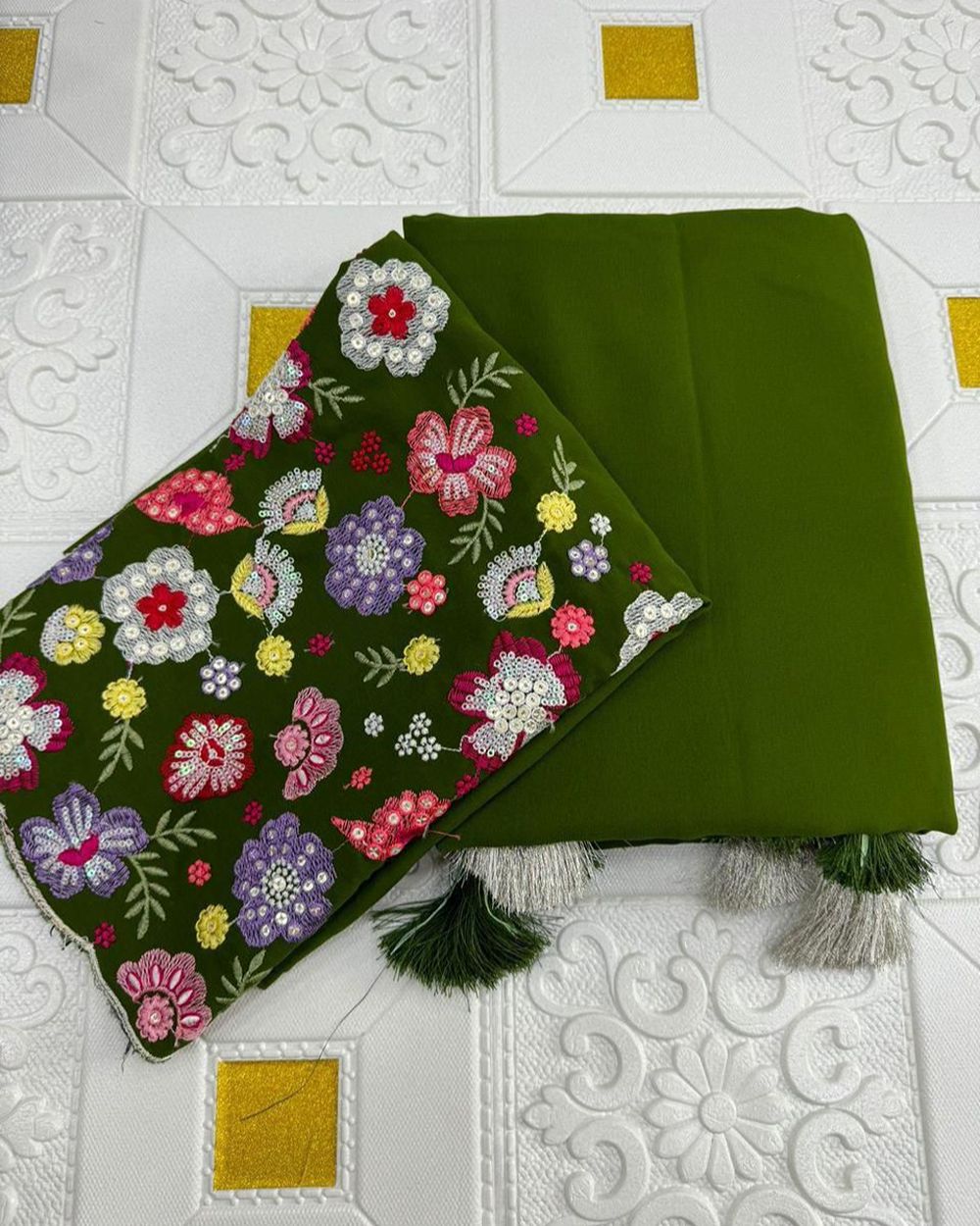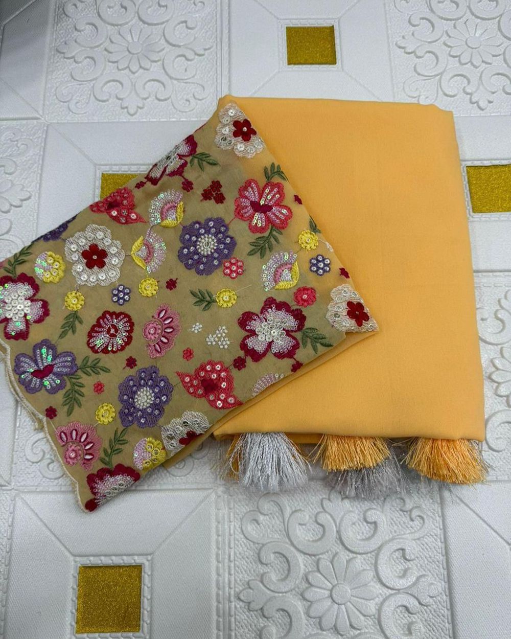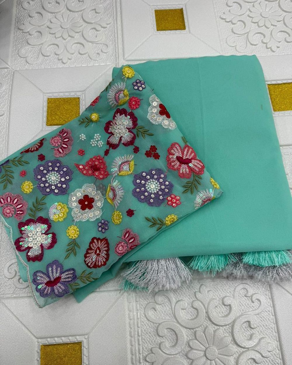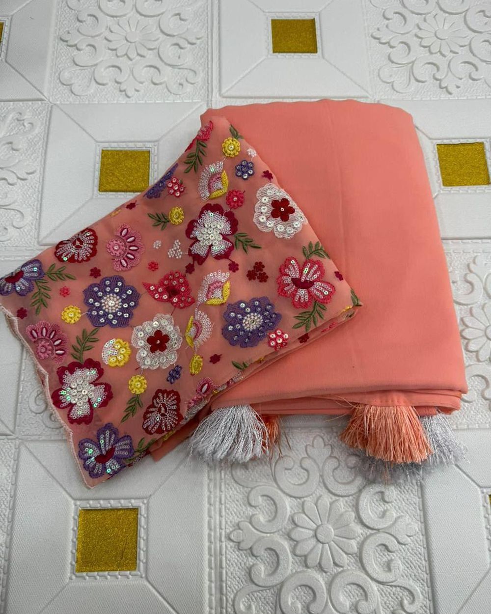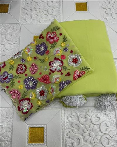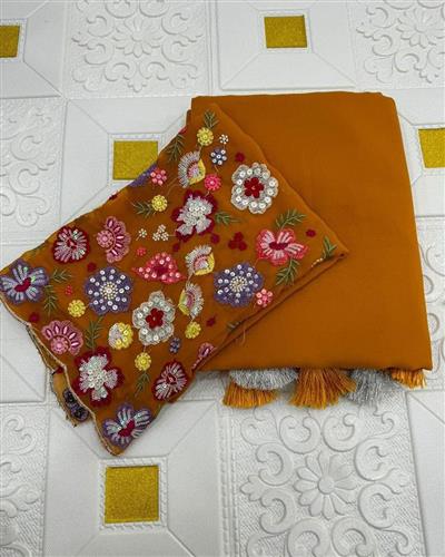 BLOUSE  : HEAVY SOFT GEORGETTE FABRIC ON FLORAL 3D EMBRDORIY MULTI THREAD AND SEQUENCE WORK ON BLOUSE