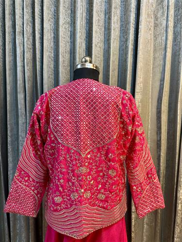 elegant Rani Pink Palazzo Koti Blouse Set crafted from luxurious Chinon fabric. Adorned with intricate multicolour embroidery and sequin work, it offers a perfect blend of tradition and glamour.