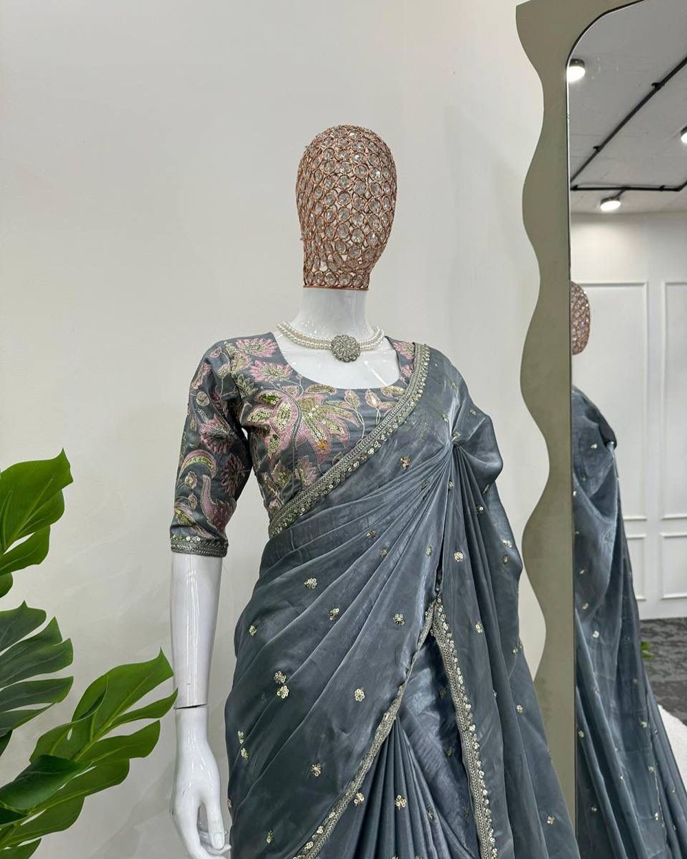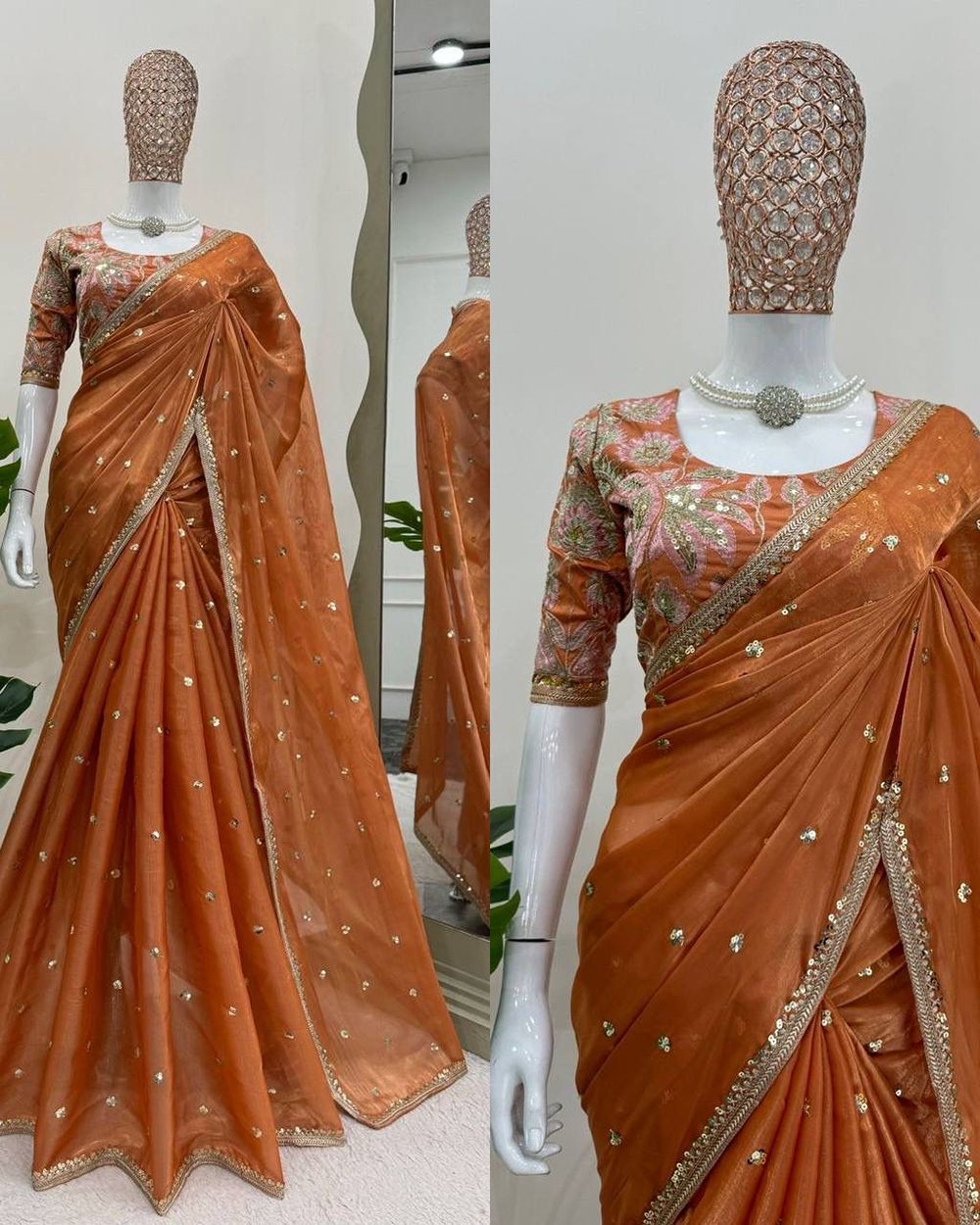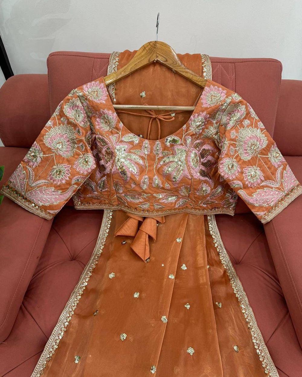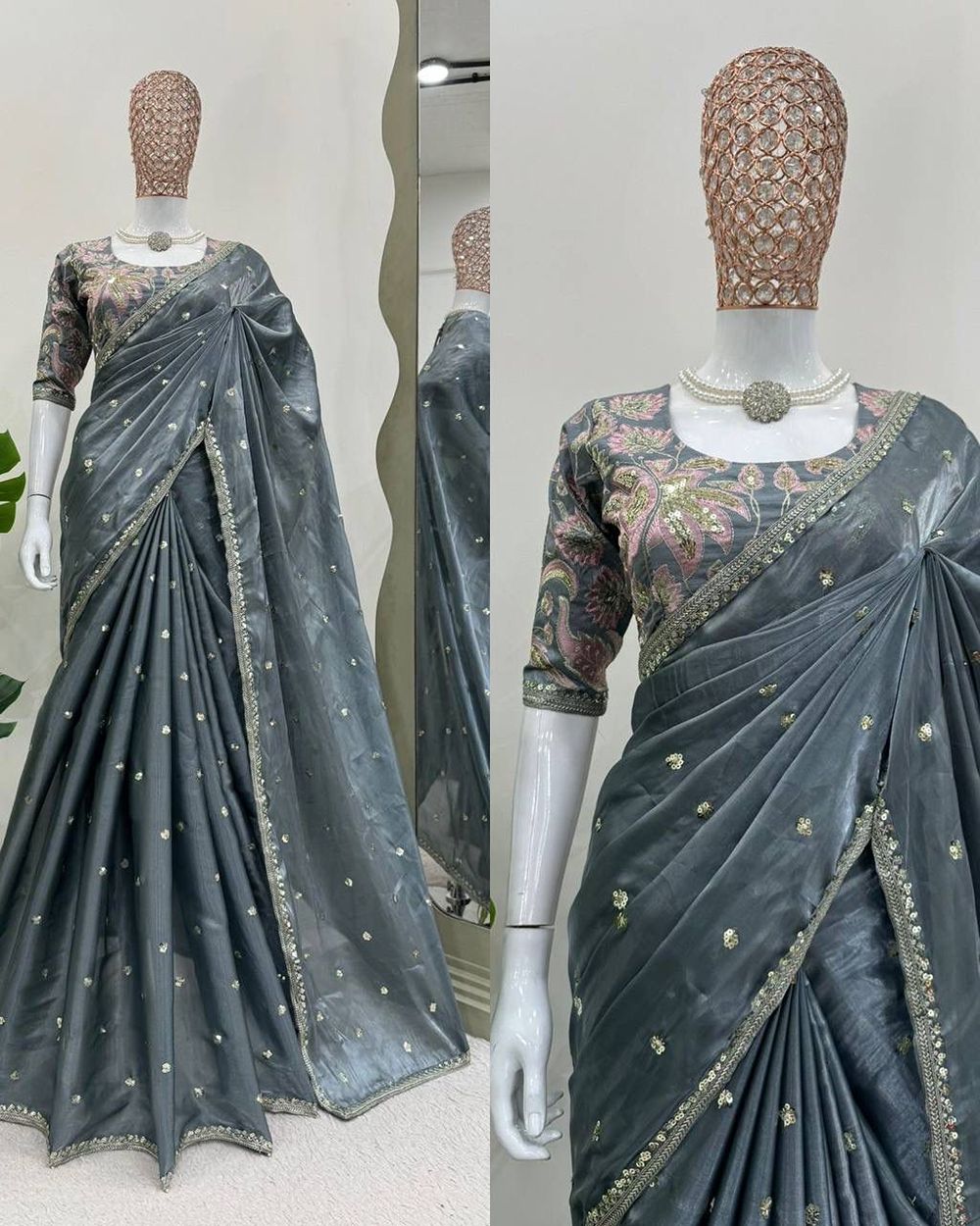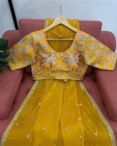 BLOUSE : HEAVY MONO BANGLORY SILK FABRIC ON HEAVY EMBRODAIRY MULTI THREADS, ZARI AND SEQUENCE WORK ON BLOUSE