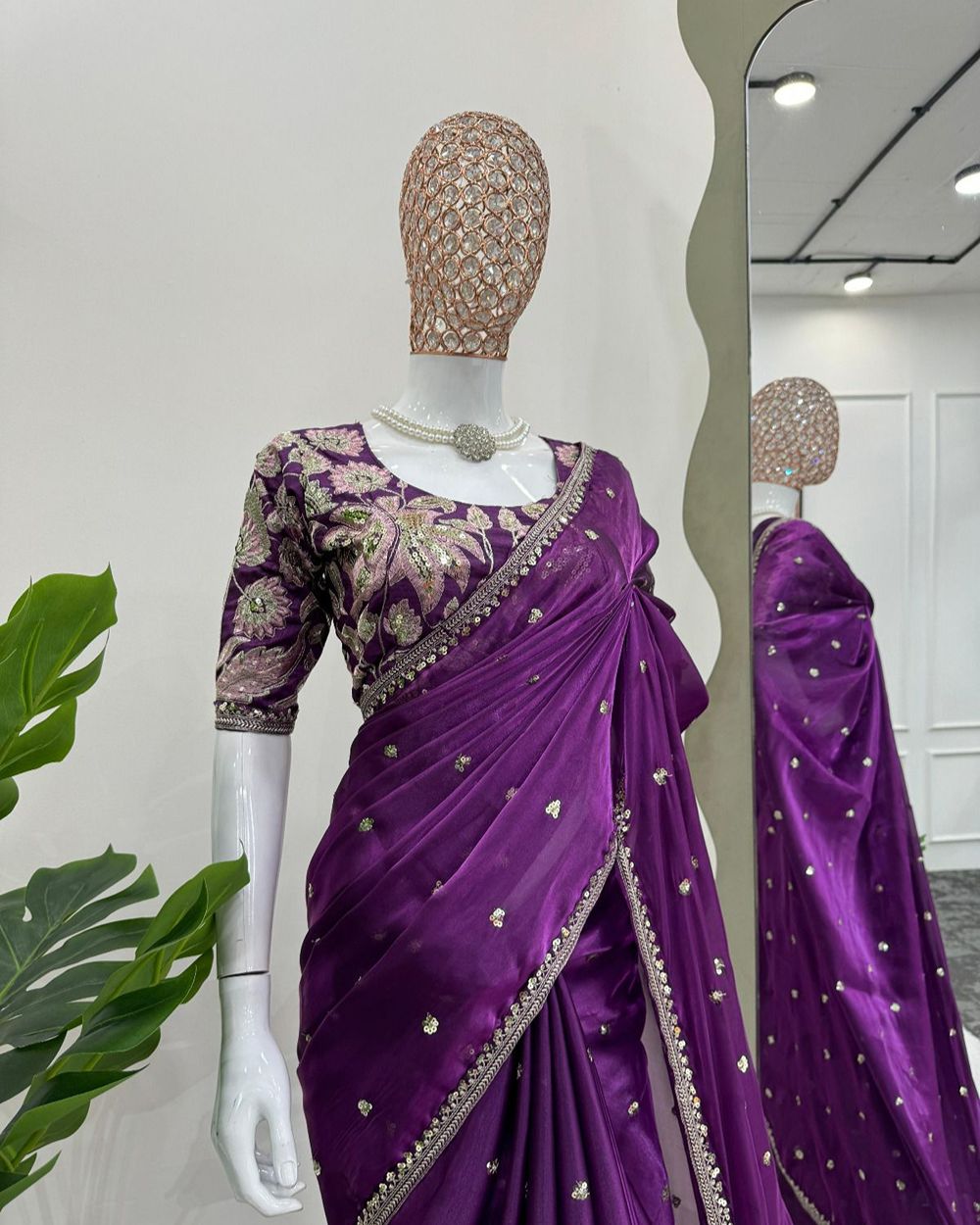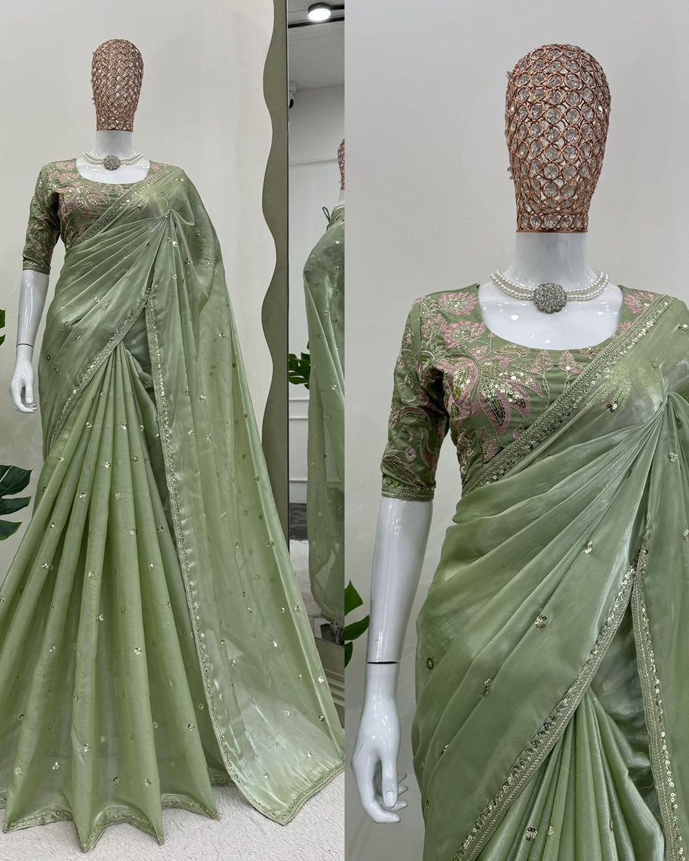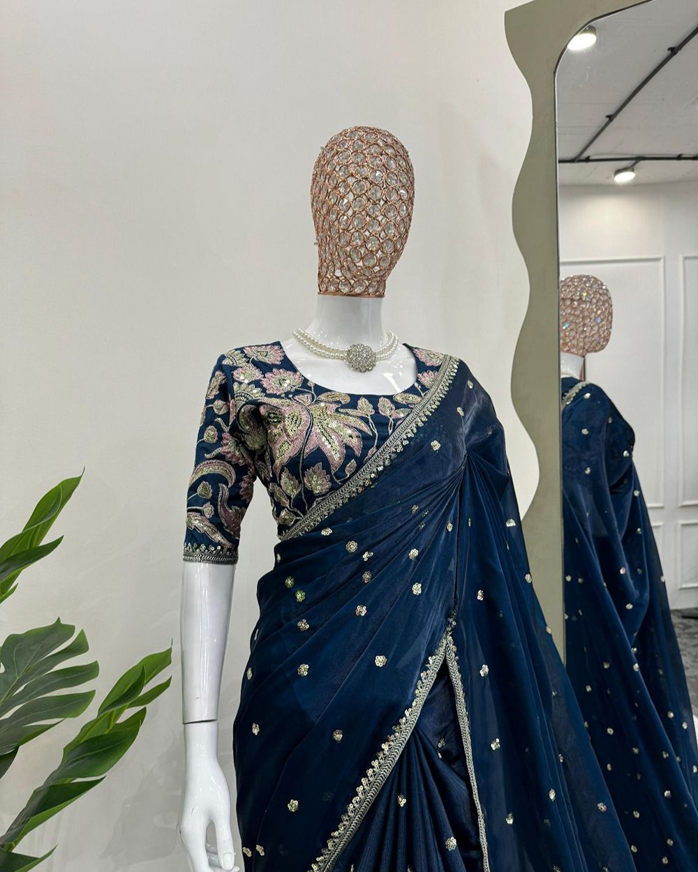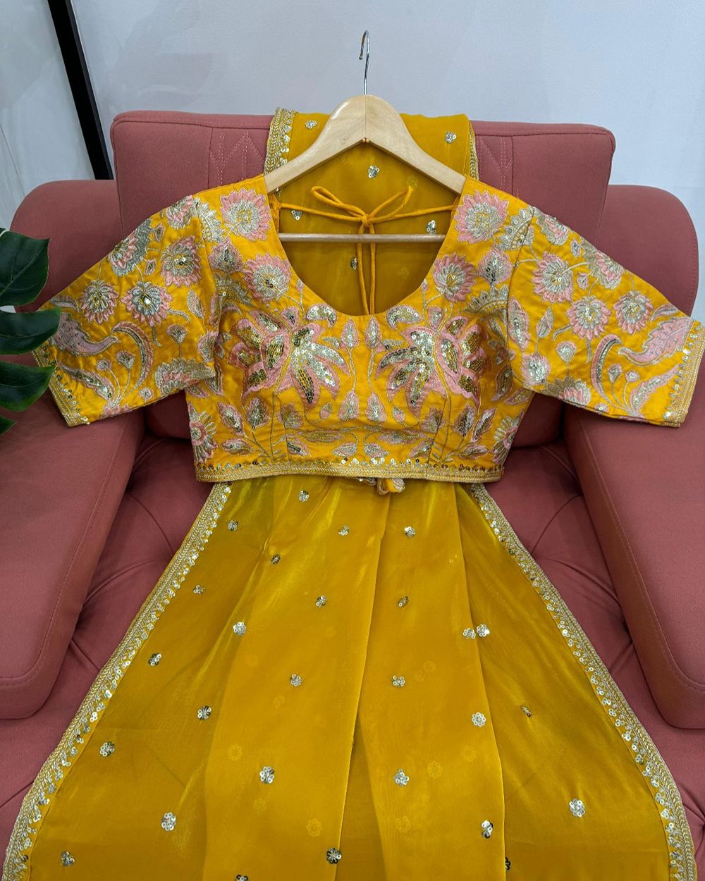 BLOUSE : HEAVY MONO BANGLORY SILK FABRIC ON HEAVY EMBRODAIRY MULTI THREADS, ZARI AND SEQUENCE WORK ON BLOUSE