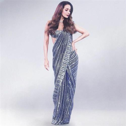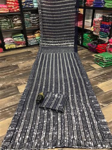 > Reigning the glam world, Vision of enchanting elegance in our six yards of glamorous "GREY" and “NAVY BLUE” color in the signature