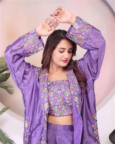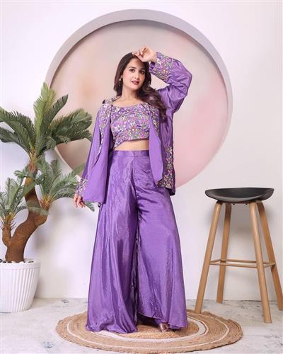 Make a bold style statement with this stunning three-piece co-ord set crafted from luxurious Chinon silk fabric. The ensemble features: