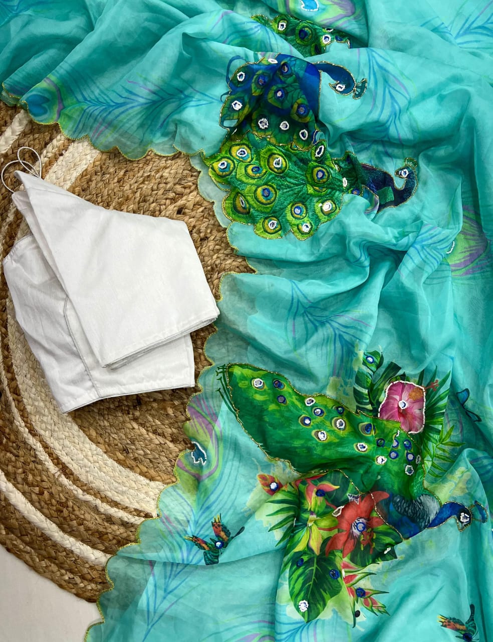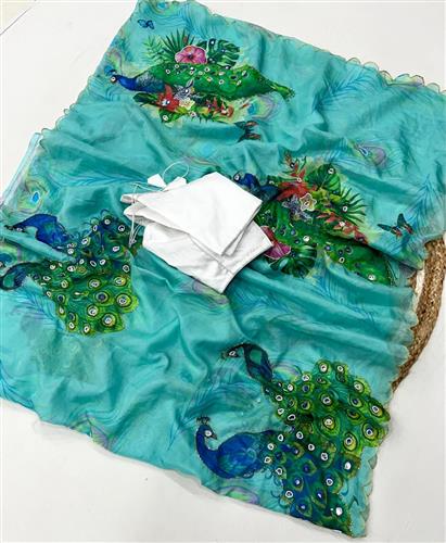 Elevate your traditional wardrobe with this exquisite handwork printed saree, a beautiful fusion of artistry and elegance. Crafted from premium quality fabric, the saree features intricate handwork embellishments, enhancing its rich printed patterns.