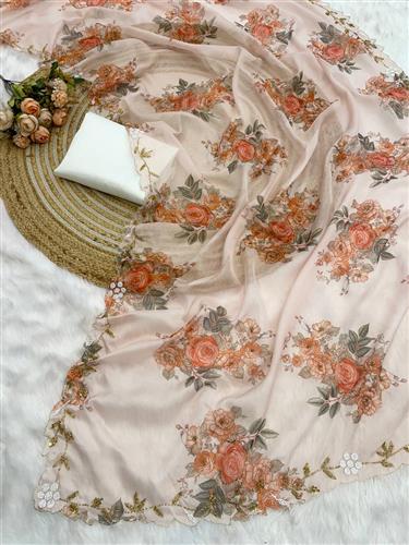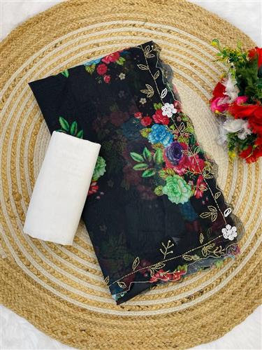 Elevate your traditional wardrobe with this exquisite handwork printed saree, a beautiful fusion of artistry and elegance. Crafted from premium quality fabric, the saree features intricate handwork embellishments, enhancing its rich printed patterns.