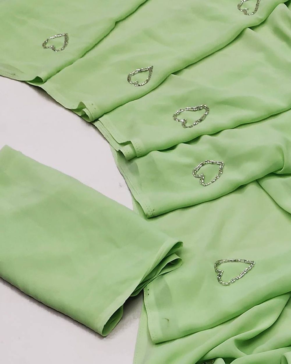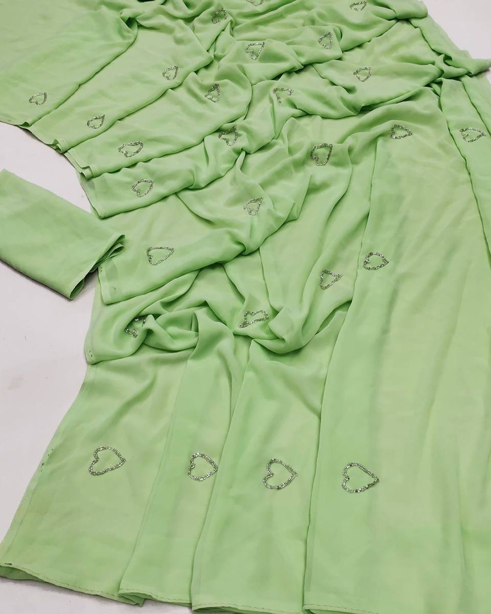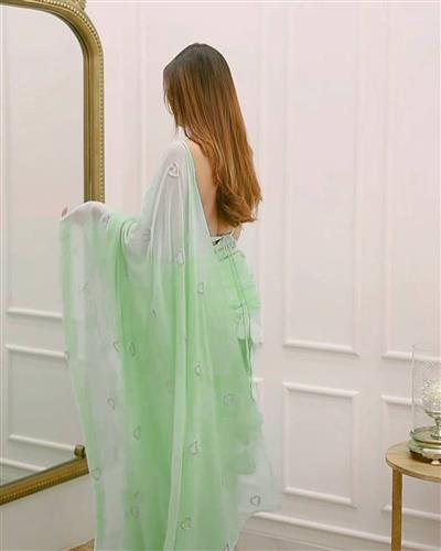 It seems like you're describing a handmade saree featuring a heart-shaped design with a green pista color. If you're looking for a specific image, design inspiration, or details about such a saree