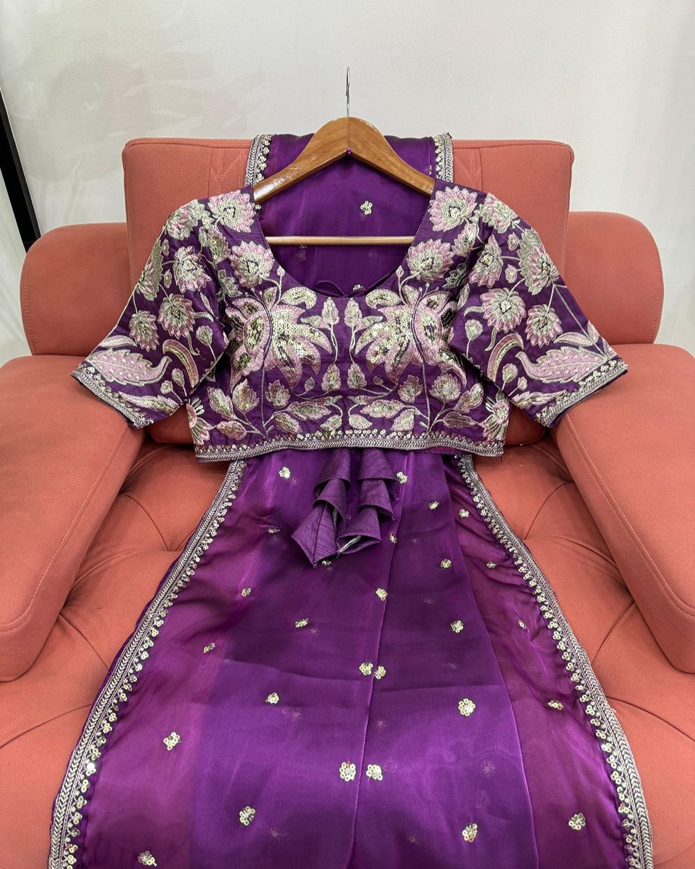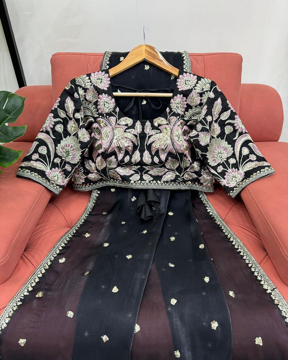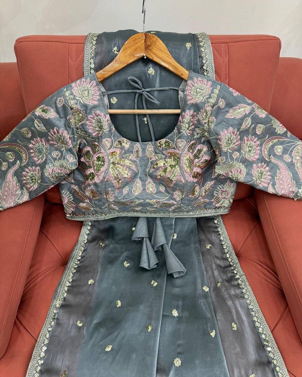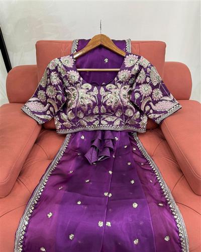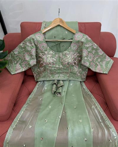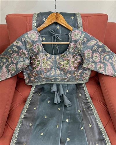 BLOUSE : HEAVY MONO BANGLORY SILK FABRIC ON HEAVY EMBRODAIRY MULTI THREADS, ZARI AND SEQUENCE WORK ON BLOUSE