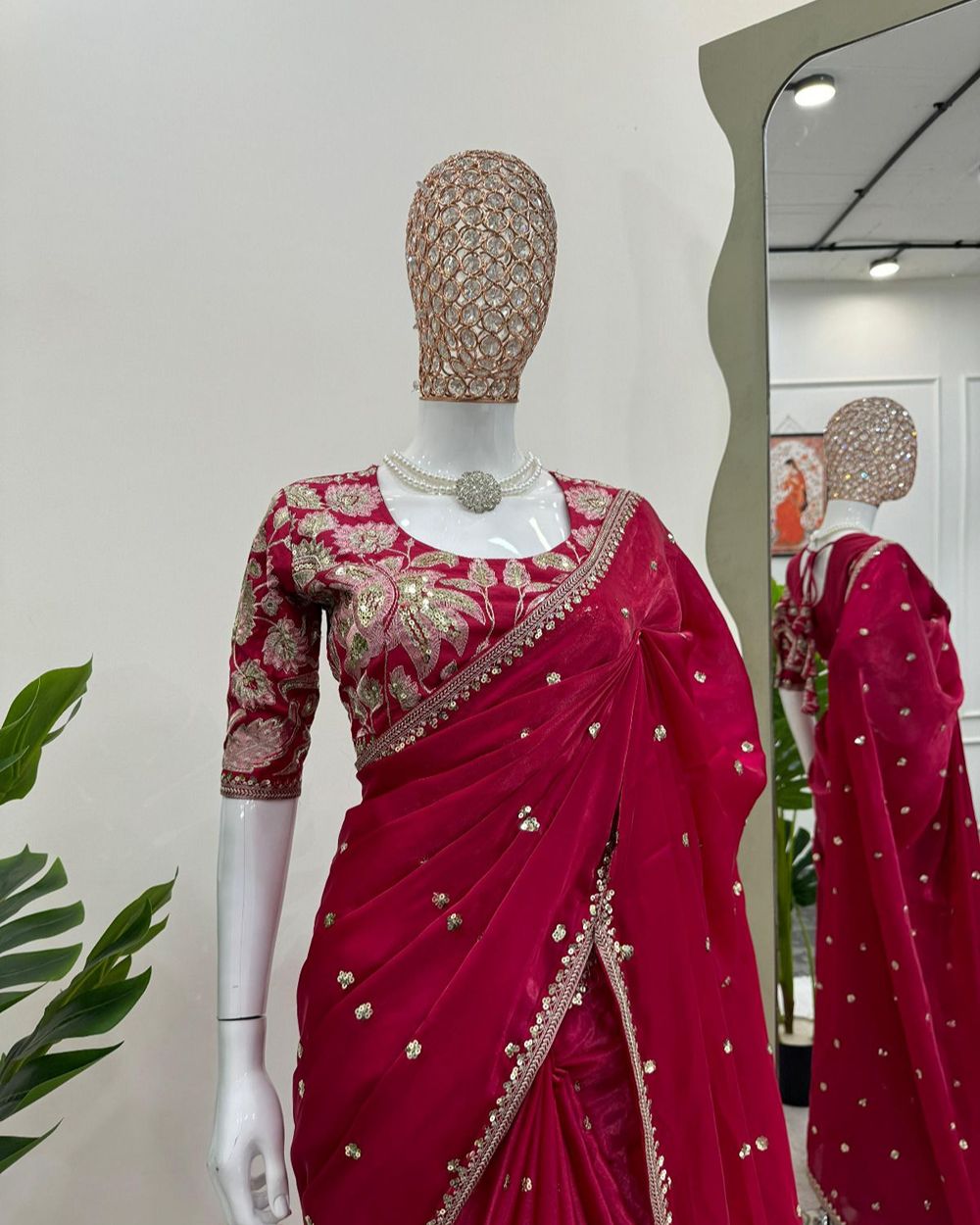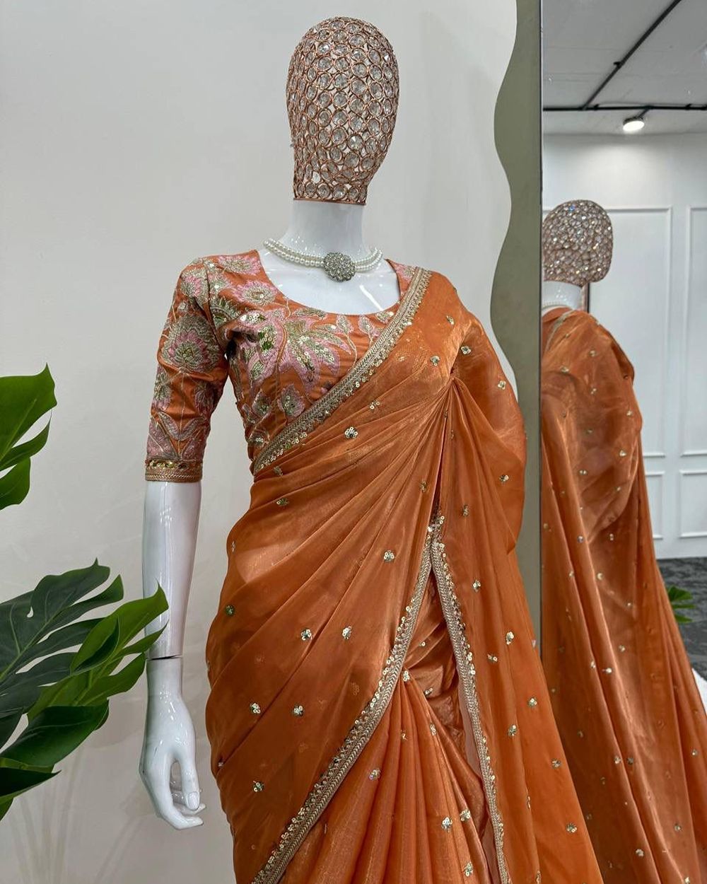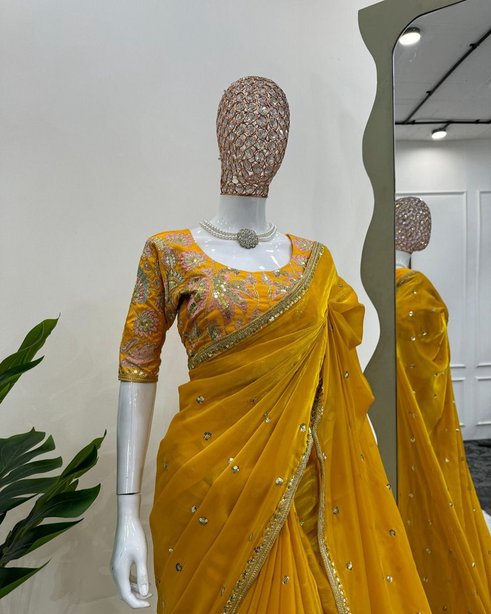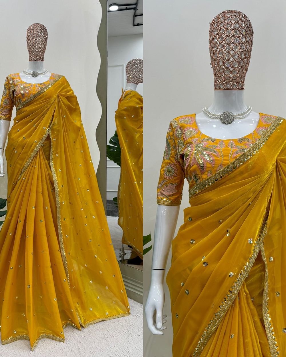 BLOUSE : HEAVY MONO BANGLORY SILK FABRIC ON HEAVY EMBRODAIRY MULTI THREADS, ZARI AND SEQUENCE WORK ON BLOUSE