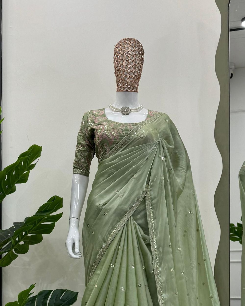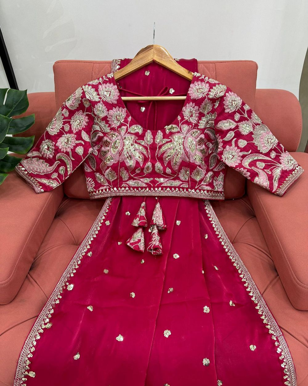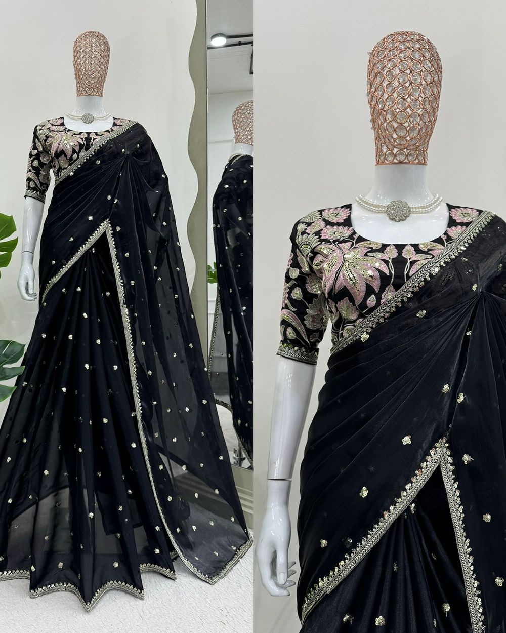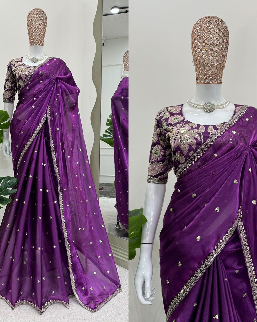 BLOUSE : HEAVY MONO BANGLORY SILK FABRIC ON HEAVY EMBRODAIRY MULTI THREADS, ZARI AND SEQUENCE WORK ON BLOUSE
