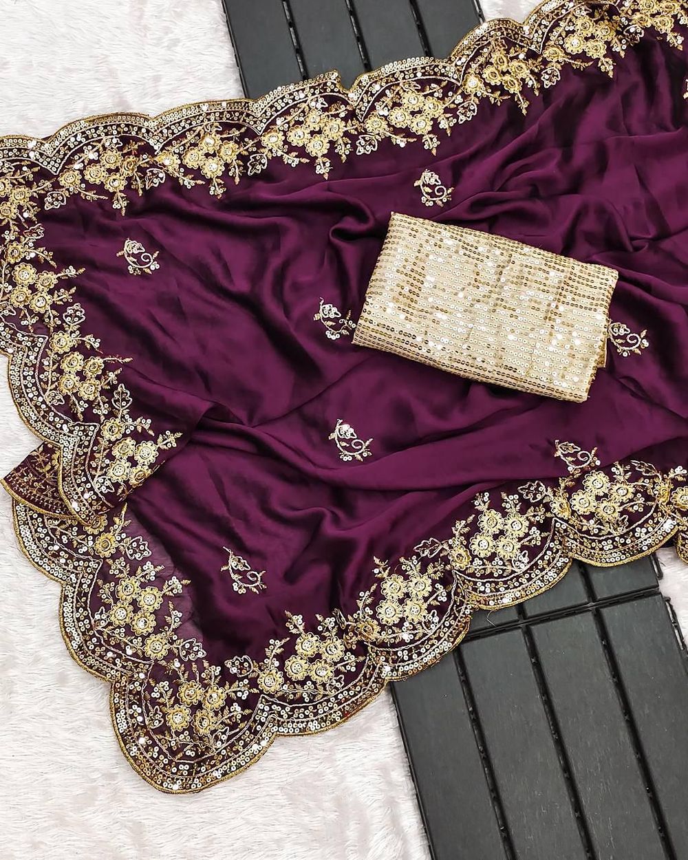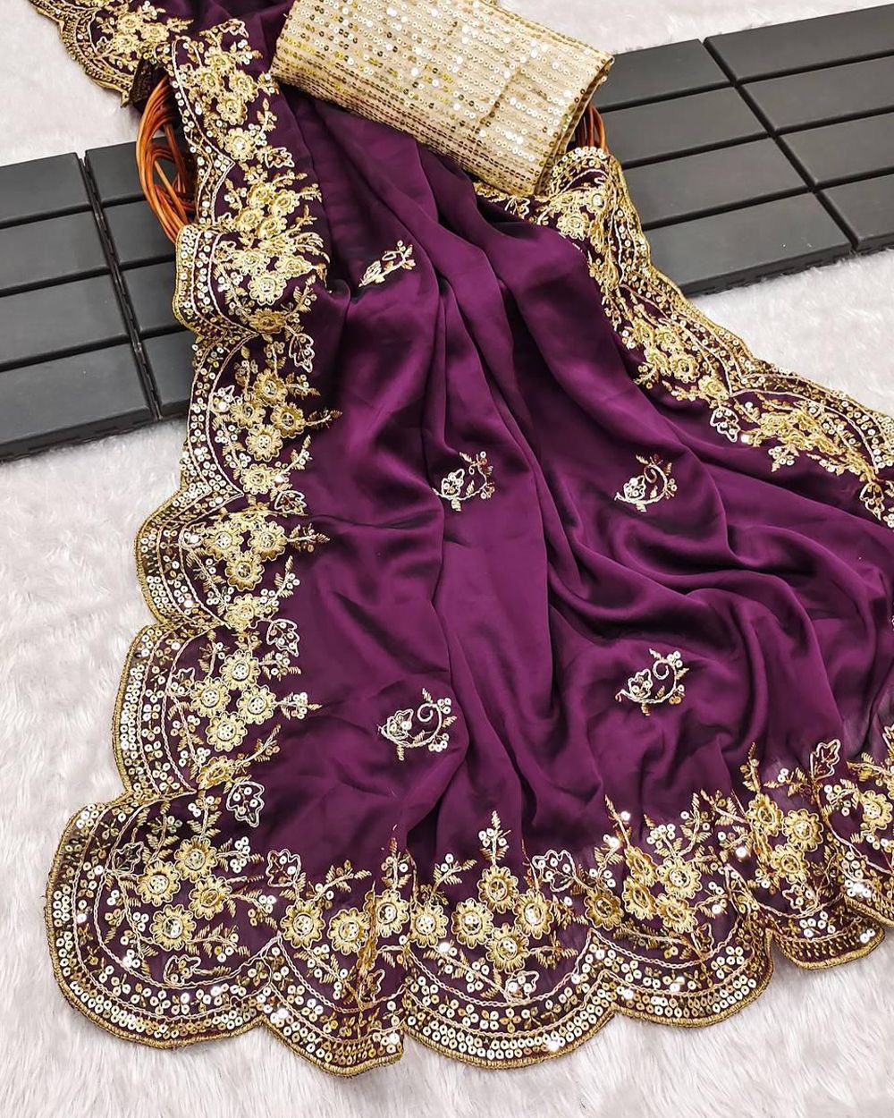 BLOUSE : HEAVY MONO BANGLORY SILK FABRIC ON HEAVY EMBRODAIRY ALL OVER SEQUENCE WORK ON BLOUSE